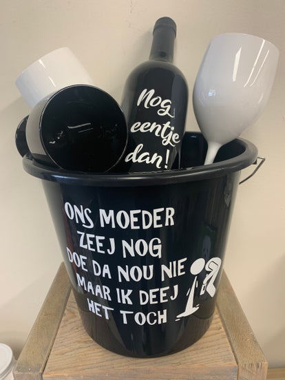 De emmer is exclusief inhoud, wel is de sticker op de wijnfles los te bestellen!