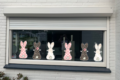 Alle drie de paashazen hebben een afmeting van: BxH 15x30 cm, sticker vel is dus BXH 45 x 30 cm.