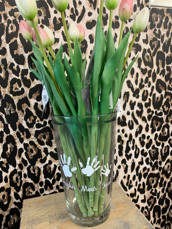 Glazen vaas met handjes en eigen namen.
