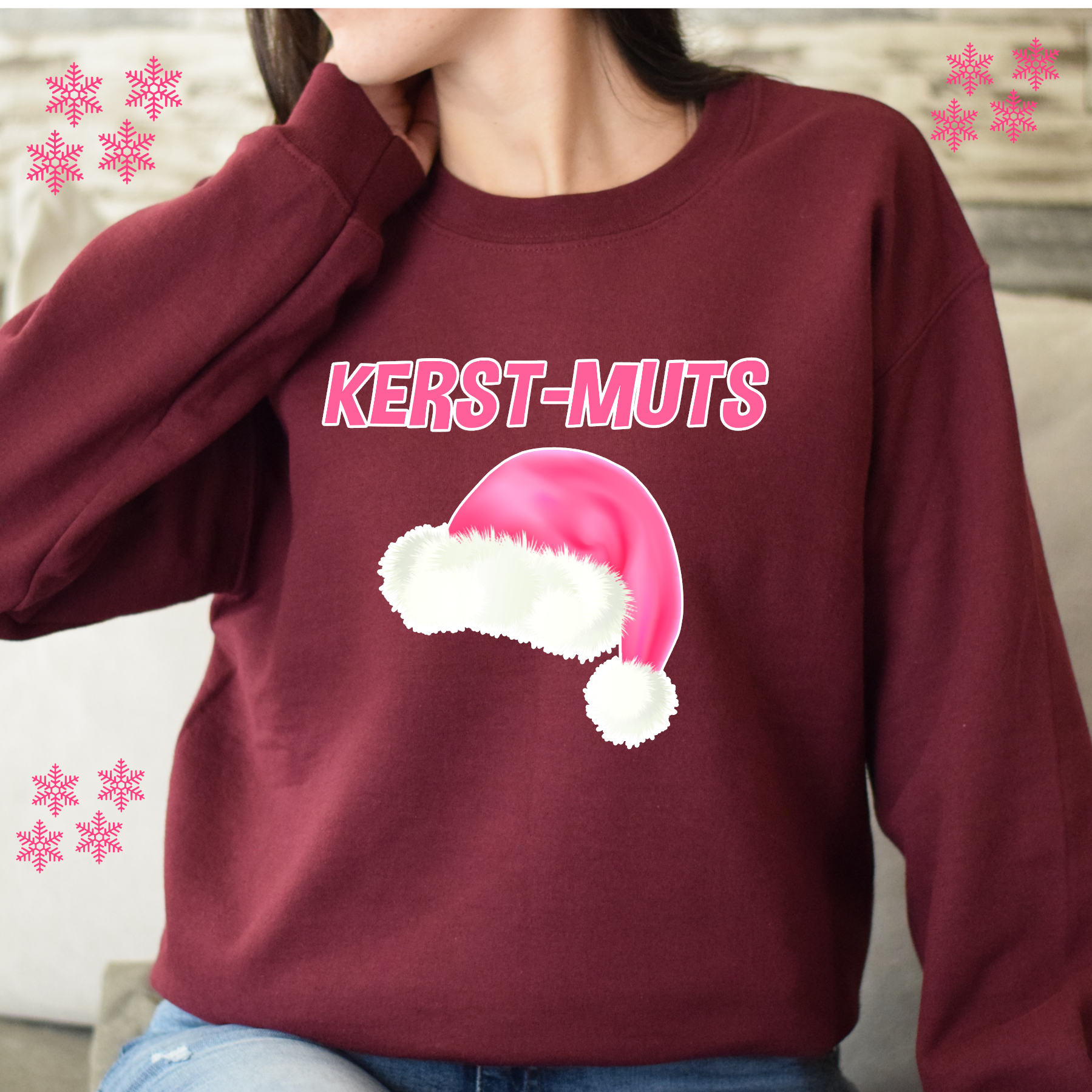 Kerstmuts roze Zwarte sweater.
