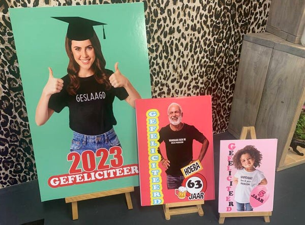 Foamboard is een hard schuim, dat aan beide zijden is beplakt met papier. Het is erg licht in gewicht en daardoor gemakkelijk mee te nemen naar een feestje of makkelijk op te hangen of neer te zetten in huis. Foamboard is bij La-Miranda verkrijgbaar in de diverse formaten.