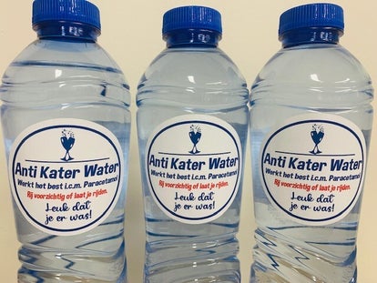 Geweldige Anti Kater Water etiketten om de avond, goed mee af te sluiten!